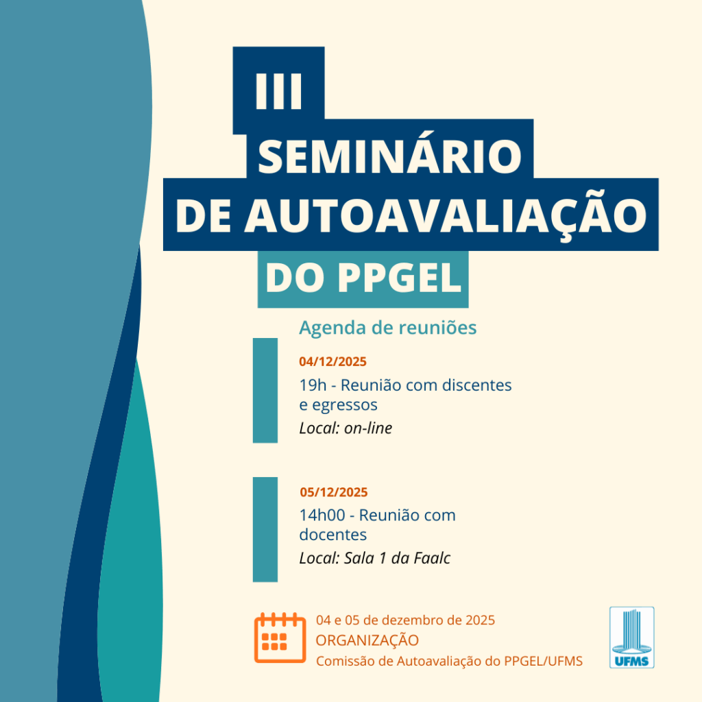 Temos o prazer de convidá-los(as) para participar do III Seminário de Autoavaliação do PPGEL/UFMS, que ocorrerá nos dias 04 e 05 de dezembro de 2025.